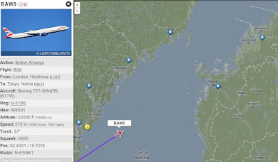 Notera hastigheten förbi Nykarleby. Ca 1060 km/h. Följer exakt jetströmmen som i lördags snyggt kurvade upp över Finland och gav en medvind på ca 50-60 m/s (ca 200 km/h).